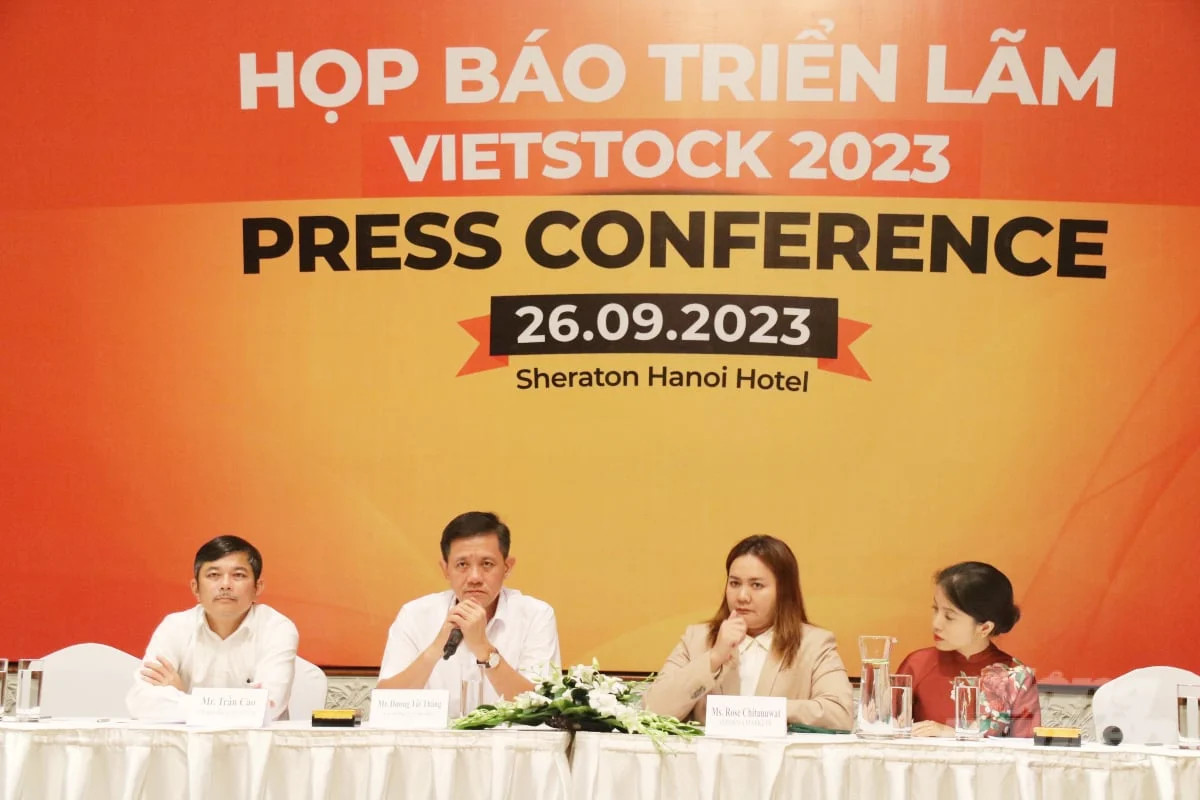 Chủ trì họp báo Vietstock 2023, từ trái sang phải có ông Trần Cao, Phó Tổng Biên tập Báo Nông nghiệp Việt Nam; ông Dương Tất Thắng, Cục trưởng Cục Chăn nuôi; và bà Rungphech Chitanuwat, đại diện Tập đoàn Infoma Markets